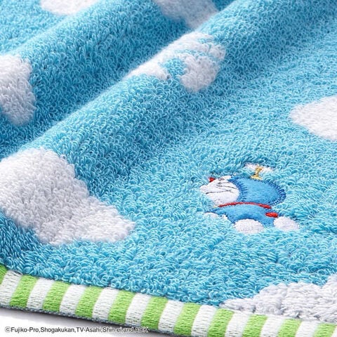 タオル一面が空のデザインとなっており、タケコプターで飛んでいるドラえもんのアップリケが可愛い1枚です。
