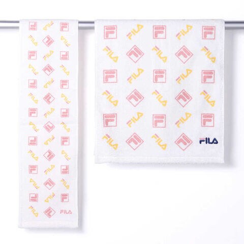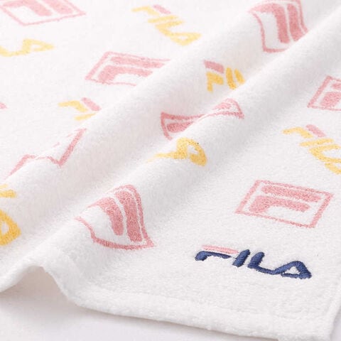 FILAのロゴとマークがタオル全体に散りばめられたポップなデザイン。