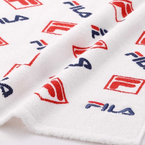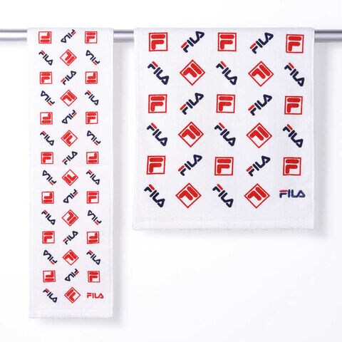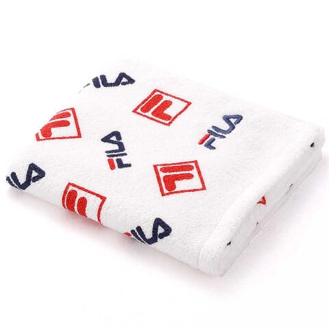 FILAのロゴとマークがタオル全体に散りばめられたポップなデザイン。