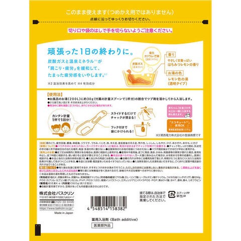 ●カリウム芒硝炭酸湯/肩こり・疲労回復に/はちみつレモンの香り/レモン色の湯(透明タイプ)