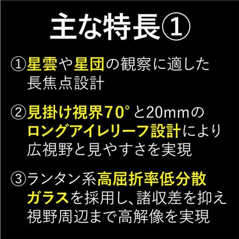 見掛け視界70°と20mm のロングアイレリーフ設計により広視野と見やすさを実現。
