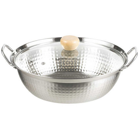 ●材質: 本体=ステンレス鋼(クロム14%) 蓋=強化ガラス ハンドル=フェノール樹脂(耐熱150度)、ステンレス鋼 つまみ=天然木