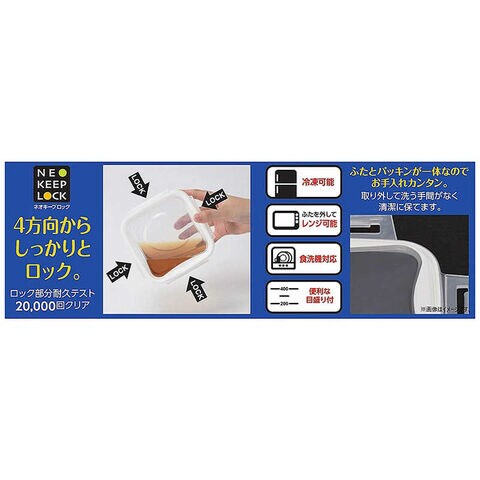 4方向からしっかりロック ロック部分、耐久テスト20000回クリア 冷凍可能 ふたを外して電子レンジOK 食洗器対応 便利な目盛付 ふたとパッキンが一体なのでお手入れカンタン。取り外して洗う手間がなく清潔に保てます。