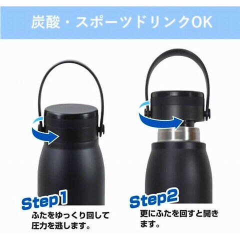 炭酸飲料を持ち運べるハンドル付きマグボトル冷たい飲みごろをキープする真空断熱構造です。