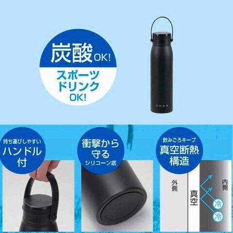 炭酸飲料を持ち運べるハンドル付きマグボトル冷たい飲みごろをキープする真空断熱構造です。