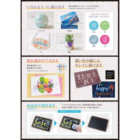 プラスチックやガラスなど非吸収面に筆記した場合、水拭きで簡単に消すことができ、くり返し使えます。