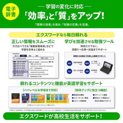 読む、聞く、書く、話すの5技能をバランスよく学習できる英語系コンテンツをはじめ、用語集、参考書、問題集などを幅広く収録。