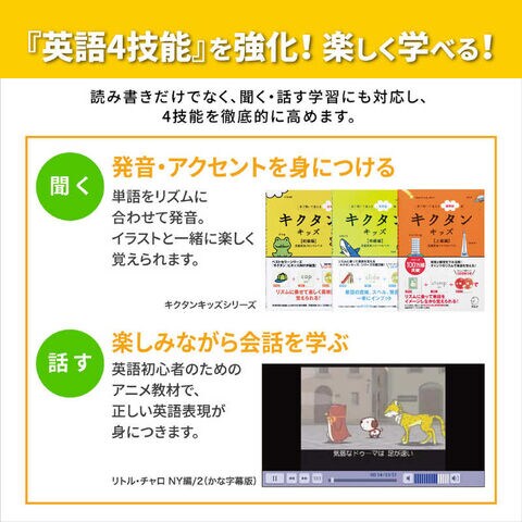 読み仮名つきで読みやすい辞書や、イラストやアニメで楽しみながら学べるコンテンツなど小学生の学習レベルに合ったコンテンツが豊富でお子様の学習意欲を育てます。
