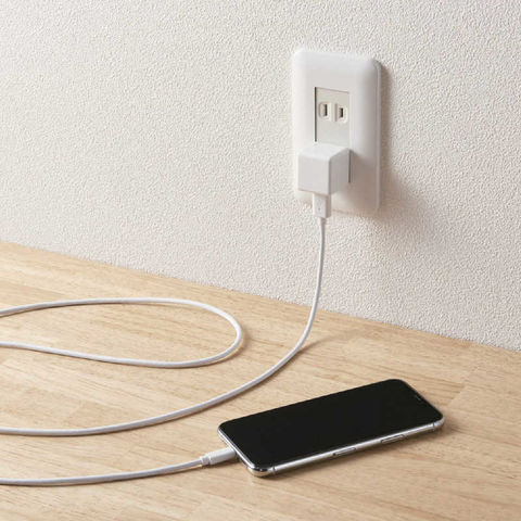 家庭用コンセントからLightningコネクタ搭載のiPhoneやiPodを充電できるLightningケーブルを付属したAC充電器です。