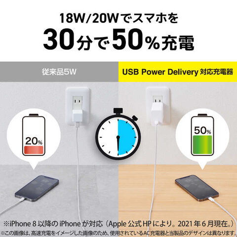 ■USB Power Delivery (パワーデリバリー)とは、アダプタと接続機器間で情報をやり取りすることで、その機器間における最適な電力を選択し、高速充電を実現するUSB規格です。最大100W(※)という高電力に対応するため、さまざまな機器での利用が広がっています。※本製品のUSB Power Delivery最大出力は20Wです。