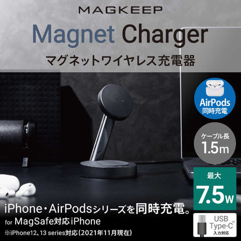 ●MagSafe対応iPhoneシリーズをマグネットで固定し7.5Wで高速充電可能で、同時にワイヤレス充電対応Airpodsシリーズも充電できるワイヤレス充電器です。