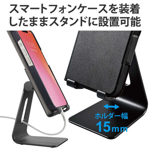 ●ホルダー部は約15mmのマチ幅があるため、スマートフォンケースを装着したままスタンドに設置できます。