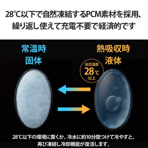 28℃以下で自然凍結するPCM素材を採用しています。溶けて液体になった場合は、28℃以下の環境に置くか、冷水に約10分間つけて冷やすと、再び凍結し冷却機能が復活します。繰り返し使えて充電が不要なので経済的です。