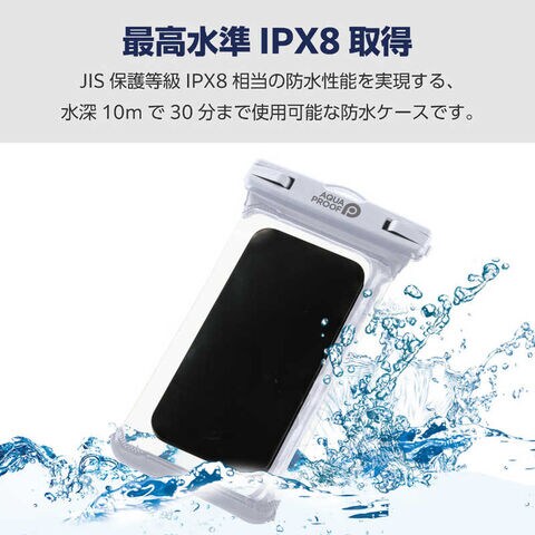 JIS保護等級 IPX8相当の防水性能を実現する、水深10mで30分まで使用可能なスマートフォン用防水ケース“AQUA PROOF”です。