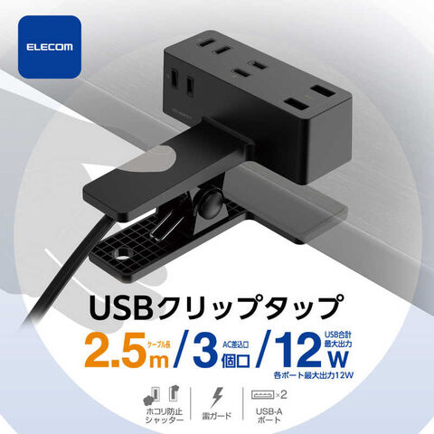 エレコム ELECOM USBクリップタップ 雷サージ付 ホコリシャッター付 3個口 USBA×2 2.4A 2.5m T-U05-3225BK