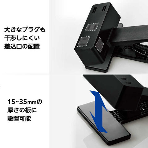 机などに挟んで使えるクリップ機構を搭載した、USBポート付きの電源タップです。