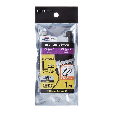 エレコム ELECOM USB2.0ケーブル/C-Cタイプ/認証品/USB Power Delivery対応/L字コネクタ/やわらか/1.0m/ブラック U2C-CCLY10NBK