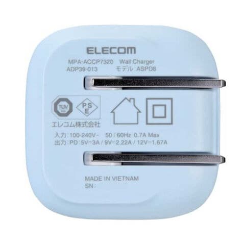 仕様1:■対応機種:USB Type-C(TM)ポートからUSB Power Delivery (20W)の規格内で充電可能な機器■定格入力電圧:AC100V~240V、50Hz/60Hz■定格入力電流:0.7A■定格出力電力:20W■定格出力電圧:5V/9V/12V■定格出力電流:5V時3A/9V時2.22A/12V時1.67A■外形寸法:幅約33.7mm×奥行約33.7mm×高さ約33.7mm■重量:約39.1g■カラー:ブルー■使用可能地域:日本■保証期間:1年間
