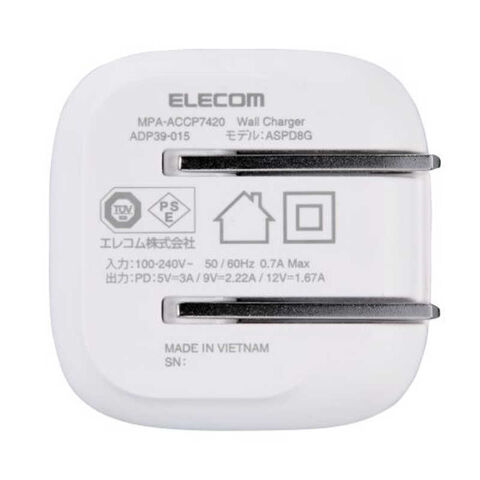 仕様1:■対応機種:USB Type-C(TM)プラグからUSB Power Delivery (20W)の規格内で充電可能な機器■定格入力電圧:AC100V~240V、50Hz/60Hz■定格入力電流:0.7A■定格出力電力:20W■定格出力電圧:5V/9V/12V■定格出力電流:5V時3A/9V時2.22A/12V時1.67A■外形寸法:幅約38.1mm×奥行約33.7mm×高さ約33.7mm■重量:約81.1g■カラー:しろちゃん(ホワイト×ブラック)■使用可能地域:日本