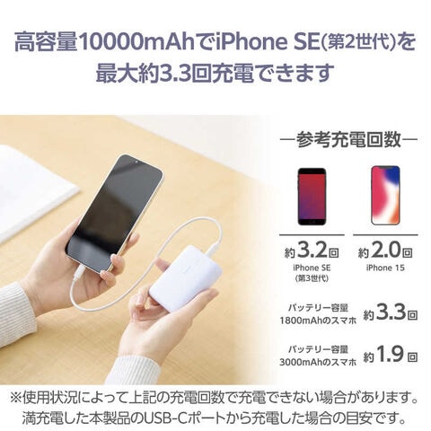 仕様2:■電池種類:充電式リチウムイオン電池■電池定格容量:3.7V 10000mAh■充電時間:約2時間30分 ※USB Power Delivery 18W以上のAC充電器を使用した場合■外形寸法:幅約58mm×奥行約26.5mm×高さ約81.5mm■重量:約190g■カラー:パープル■くり返し使用回数:500回■付属品:USB Type-C - USB Type-Cケーブル(0.1m)■電気用品安全法:○PSE 特定以外の電気用品■保証期間:1年間