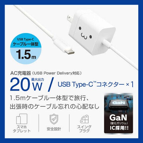 エレコム ELECOM USB Type-C 充電器 PD 20W Type C ケーブル 一体型 1.5m しろちゃん MPA-ACCP6920WF