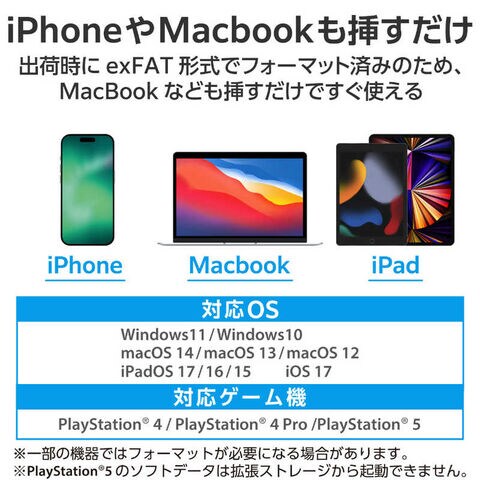 出荷時にexFAT形式でフォーマット済みのため、USB Type-C(TM)ポートを搭載したiPhoneやMacBook、iPadなどでも、ケーブルやアダプターを別途購入することなく、接続するだけですぐに使用可能です。