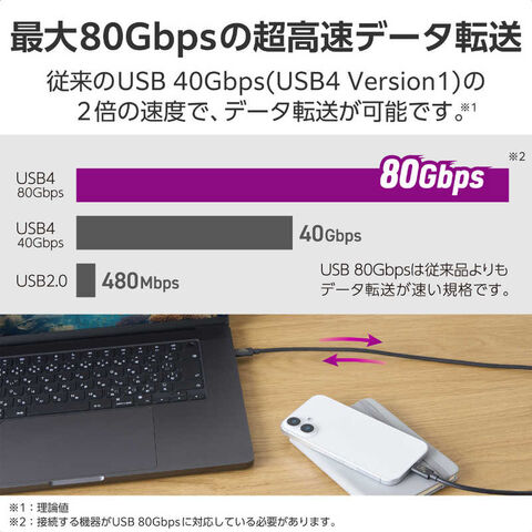従来のUSB 40Gbps(USB4 Version1)の2倍の速度で、接続した機器間のデータ転送が可能です。