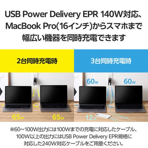 ※60~100W出力には100Wまでの充電に対応したケーブルを、100W以上の出力にはUSB Power Delivery EPR規格に対応した240W対応ケーブルをお使いください。