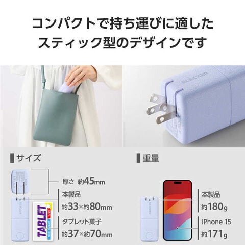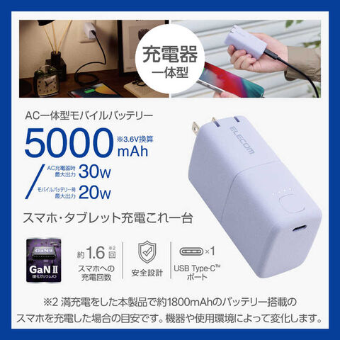 エレコム ELECOM モバイルバッテリー コンセント一体型 5000mAh PD 最大30W 入力出力( USB Type-C ×1) PSE適合 小型 折りたたみプラグ パープル DE-AC09-5000PU