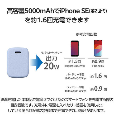 本製品(バッテリー容量5000mAh)で、1800mAhのスマートフォンを約1.6回、3000mAhのスマートフォンを約0.9回充電可能です。