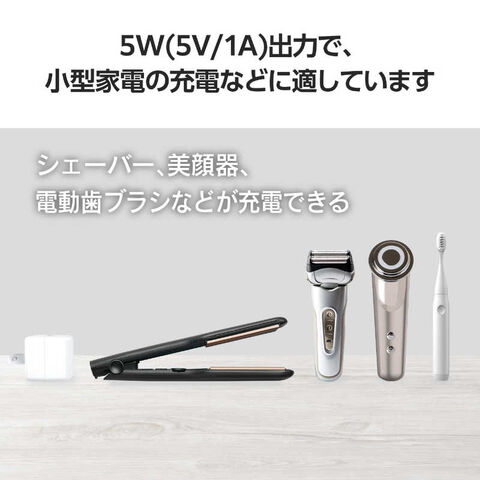 シェーバーや電動歯ブラシ、ヘアアイロンなど、5V/1A(5W)でAC充電器からの充電が可能な小型家電を充電できます。