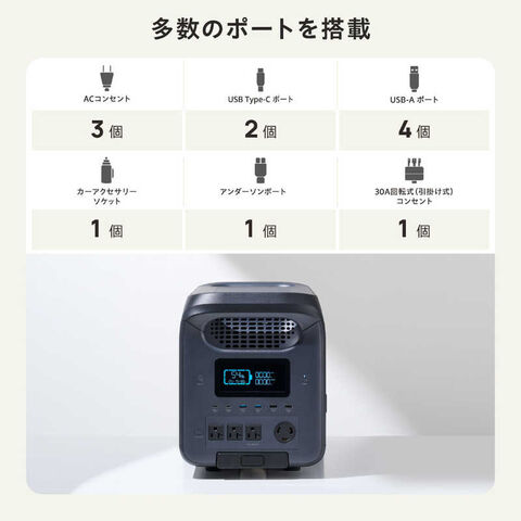 ACコンセントを3口、ACコンセント(回転)を1口、USB Type-C(TM)ポートを2口、USB-Aポートを4口、カーアクセサリーソケットを1口、アンダーソンポートを1口搭載しています。