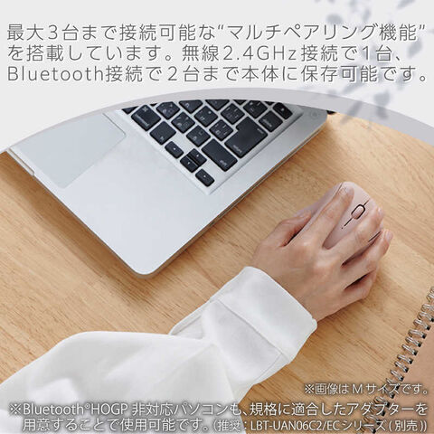 パソコンのUSB-Aポートにレシーバーを挿すだけの無線2.4GHz接続と、USB-Aポートのないパソコンやタブレットでも使えるBluetooth(R)接続の両方に対応するワイヤレスモデルです。