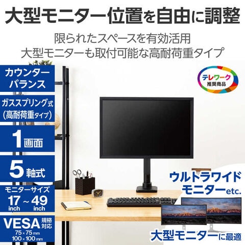 17インチ~49インチサイズのモニターに対応する高耐荷重ガススプリング式のカウンターバランス シングルモニターアームです。