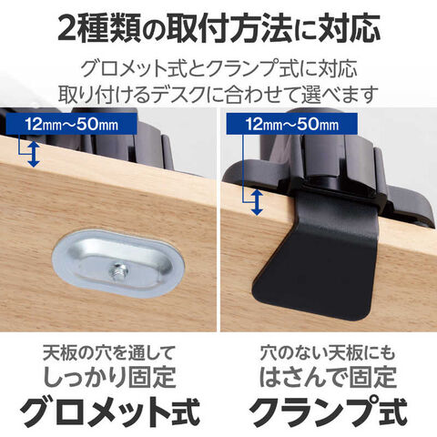 デスクの天板に挟んで固定するクランプ式と、天板に穴を開けてボルトを通して固定するグロメット式の2通りの取り付け方法が選べます。