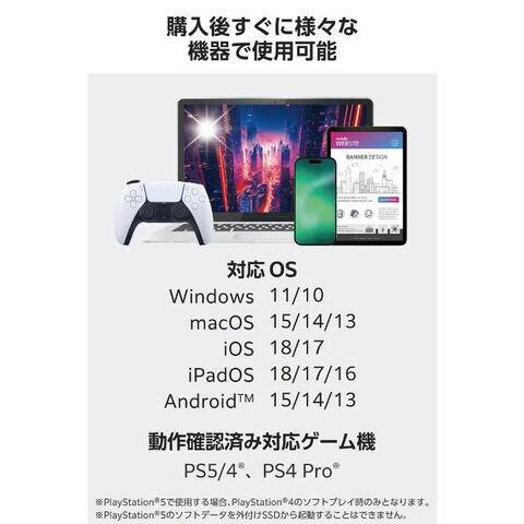 PlayStation(R) 5に接続し、PlayStation(R) 5のゲームデータを外付けSSDに保存することで、本体ストレージの空き容量を確保が可能です。