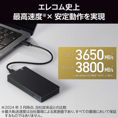 仕様2:[インターフェース]USB 40Gbps(USB4(Version 1))[コネクター形状]USB Type-C(TM)[データ転送速度]読み込み:最大3650MB/s、書き込み:最大3800MB/s ※エレコム社環境での測定値 ※USB 40Gbps(USB4(Version1))でご使用になるには、機器側がUSB 40Gbps(USB4(Version1))に対応している必要があります。[出荷時フォーマット]exFAT[冷却FAN]○(温度検知)[電源]USBバスパワー