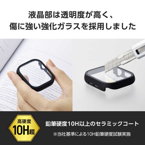 鉛筆硬度10H以上のセラミックコートを施したGorilla(R)ガラスと耐衝撃性の高いポリカーボネート素材の2重構造で、Apple Watchの画面および側面部を保護します。