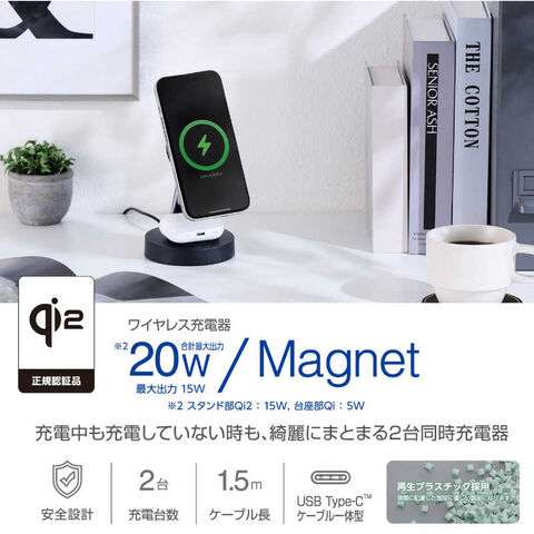 エレコム ELECOM ワイヤレス充電器 Qi 認証 Qi2 対応 15W/ 7.5W/ 5W マグネット式 充電スタンド 2in1 同時充電 ケーブル一体 1.5m W-MS11BK
