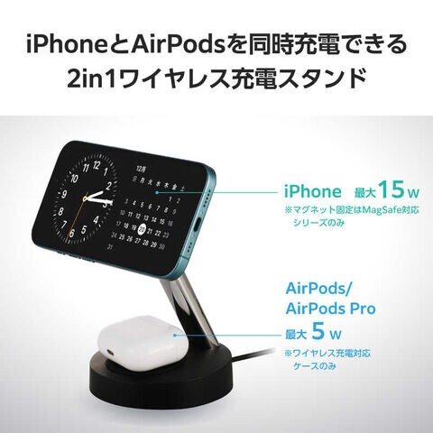 マグネットで固定するだけでQi2対応スマートフォンと対応するAirPodsを同時に充電できる、2in1 Qi2規格ワイヤレス充電スタンドです。