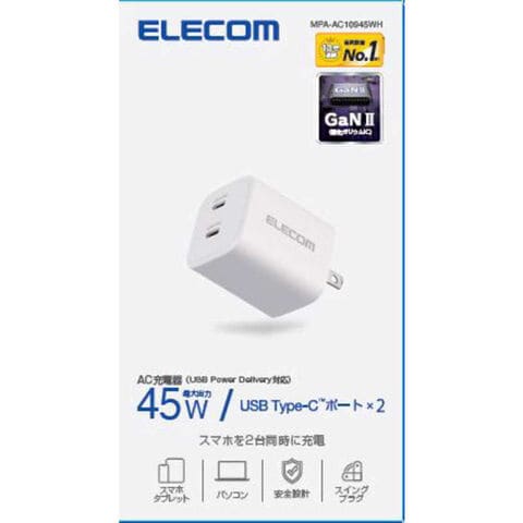 エレコム ELECOM AC充電器 スマホ・タブレット用 USB PD 45W USB-C×2 スイングプラグ MPA-AC10945WH