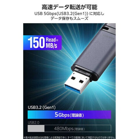 USB 5Gbps(USB3.2(Gen1))対応で、読み込み時の最大データ転送速度150MB/sを実現しています。