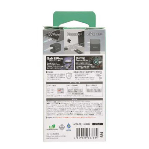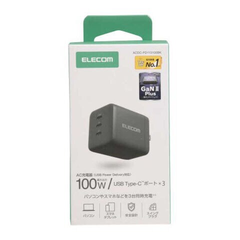 エレコム ELECOM 充電器 PD 100W / PPS対応 高速充電 3ポート USB-C ×3 GaN II採用 PSE認証 コンパクト 折りたたみ式プラグ ACDC-PD113100BK
