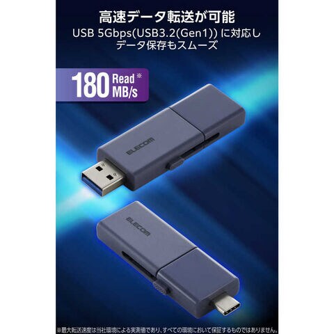 USB 5Gbps(USB3.2(Gen1))に対応し、読み込み時最大180MB/sの高速データ転送を実現します。