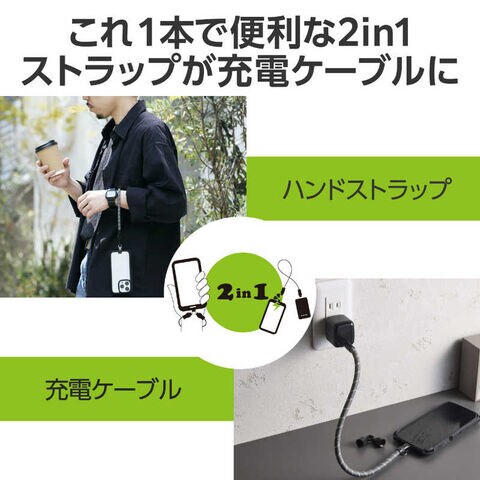 エレコム ELECOM スマホストラップ ケーブル 2in1 ハンドストラップ / 充電ケーブル USB Type-C to C 30cm ブラック/ストライプ P-STHH1CC08BK2