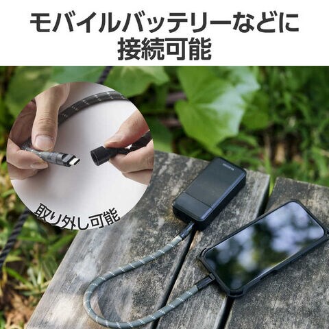 充電ケーブルとして使用する際は、モバイルバッテリーなどに接続することでどこでも充電が可能です。