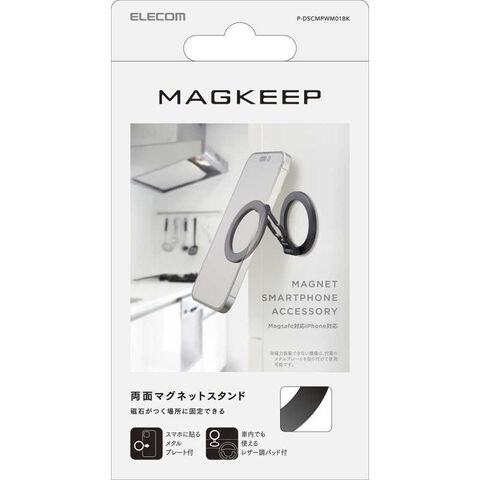 仕様1:■対応機種:MagSafe対応のiPhone ※2025年05月現在■セット内容:両面マグネットスタンド×1、メタルプレート×1、マグネットパッド×1■材質:マグネットスタンド:亜鉛合金・磁石、メタルプレート:鉄、マグネットパッド:合成皮革■外形寸法:マグネットスタンド:幅約60mm×厚み約16mm×高さ約60mm(折り畳み時)■重量:約85g■カラー:ブラック