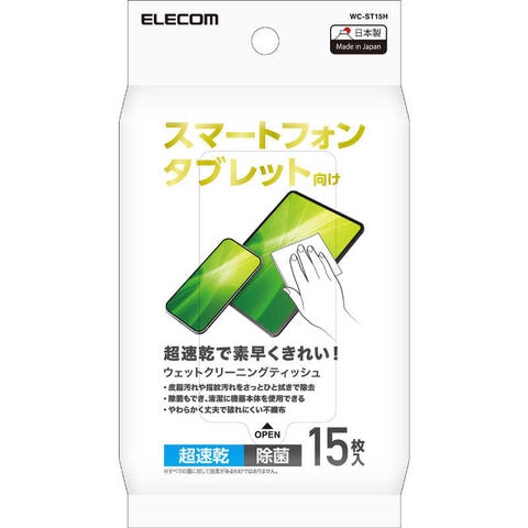 仕様1:[対応機器]スマートフォン・タブレット向け[主成分]精製水、エタノール(アルコール)、防腐剤[材質]レーヨン系スパンレース[サイズ]ティッシュサイズ:150mm×150mm[枚数]15枚入り