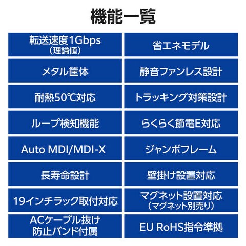 仕様3:[パケット転送速度]1488095パケット/秒(1000Mbps)、148809パケット/秒(100Mbps)、14880パケット/秒(10Mbps)[MACアドレス登録数]8192件(全ポート合計)[ジャンボフレーム]対応(15Kbytes)[ノンブロッキング]対応[EAP透過機能]対応[BPDU透過機能]対応[ループ検知・防止機能]ループ検知[PoE仕様]非対応[電源仕様]内蔵電源[入力電圧]AC100~240V±10% 50/60Hz