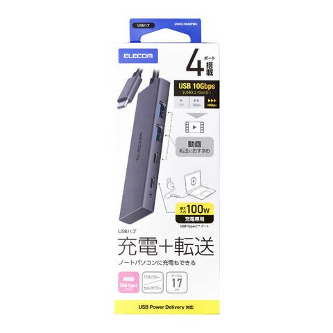 エレコム ELECOM USB Type-C ハブ 4ポート 10Gbps 高速 PD 100W ( MacBook iPad Windows 等対応 ) 薄型 USB-C ×2 USB-A ×2 ブラック U3HC-H042PBK